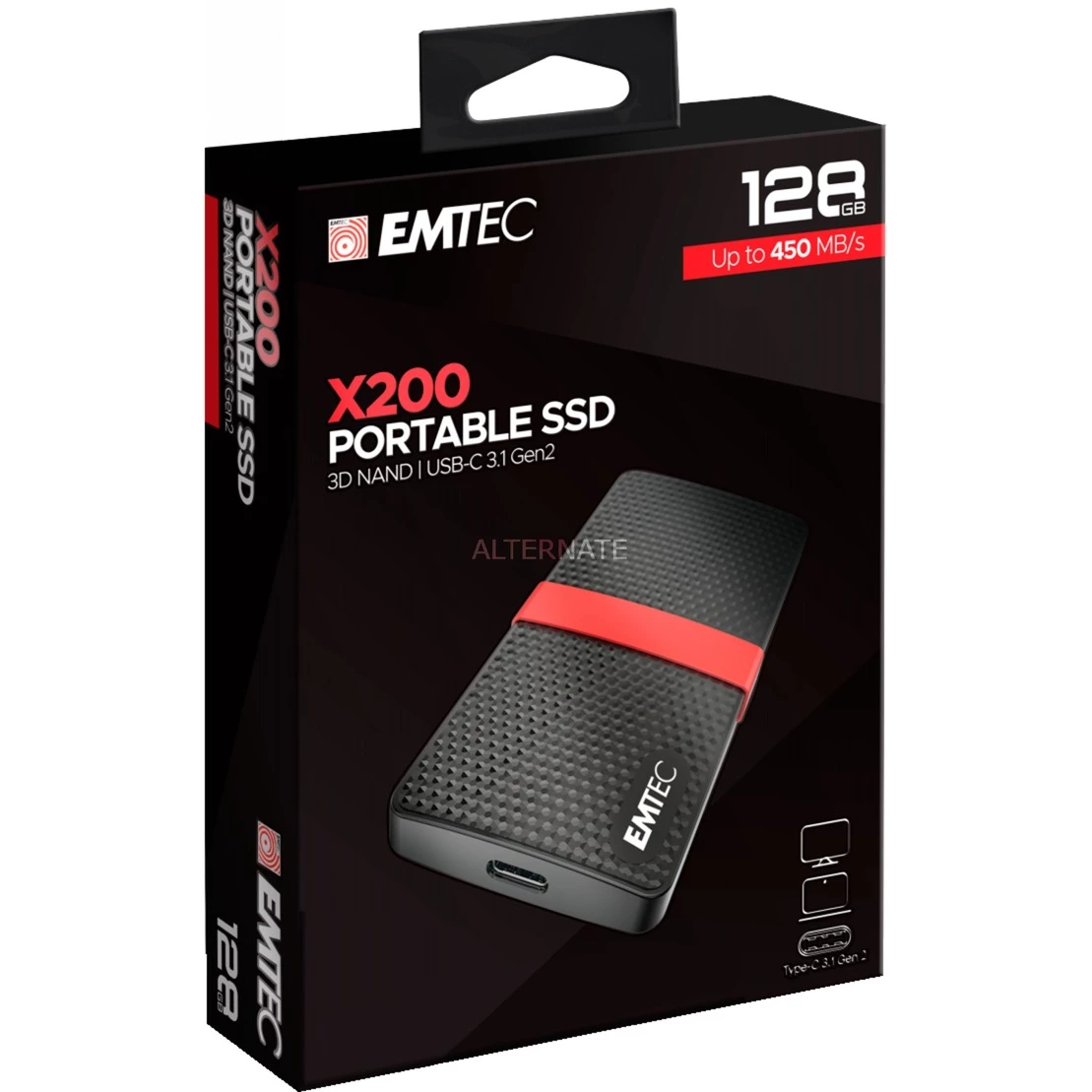 Emtec X200 Portable SSD 128 GB, Externe SSD (schwarz/rot, USB-C 3.2 Gen 1 (5 Gbit/s))