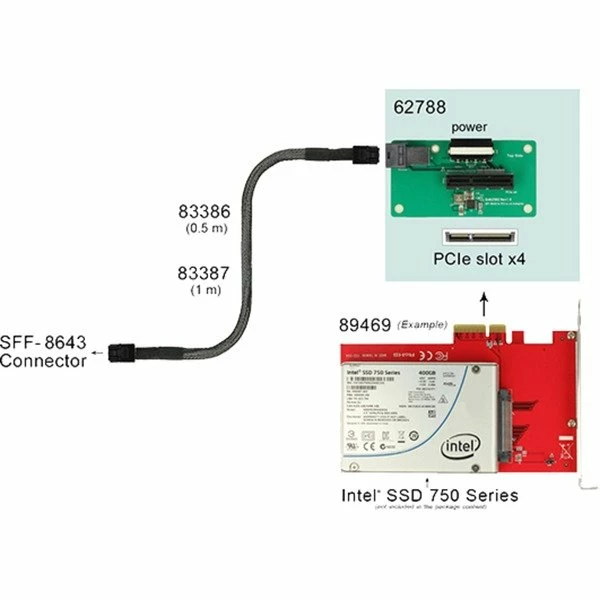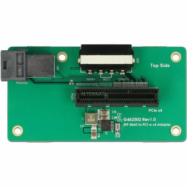 Dieser Delock Adapter kann über die SFF-8643 Schnittstelle in das System eingebunden werden und stellt dann einen PCI Express x4 NVMe Slot zur Verfügung. An diesen Slot können dann z. B. PCI Express Karten mit M.2 Slot für M.2 PCIe Module angeschlossen werden.